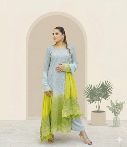 Elegant Shamoz silk shirt paired with a stylish farsi shalwar and a beautiful tissue dupatta. The 3-yard dupatta is finished with kiran lace all over, giving the outfit a graceful and festive look.